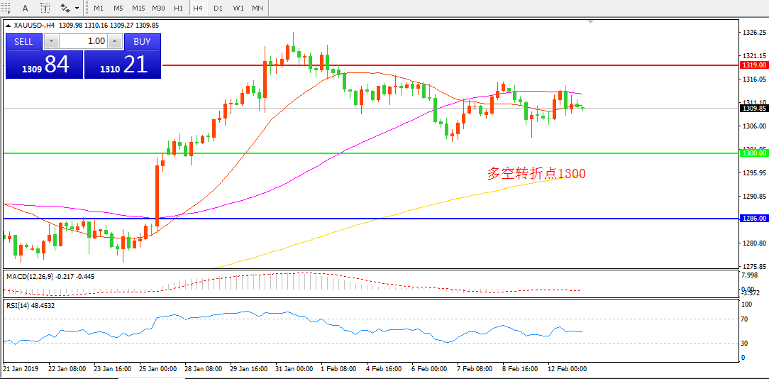 4小时图看,金价围绕着1310一线反复争夺,形态上震荡幅度逐渐收窄,MACD绿柱缩短,红柱增加。日内重点关注1300一线支撑。