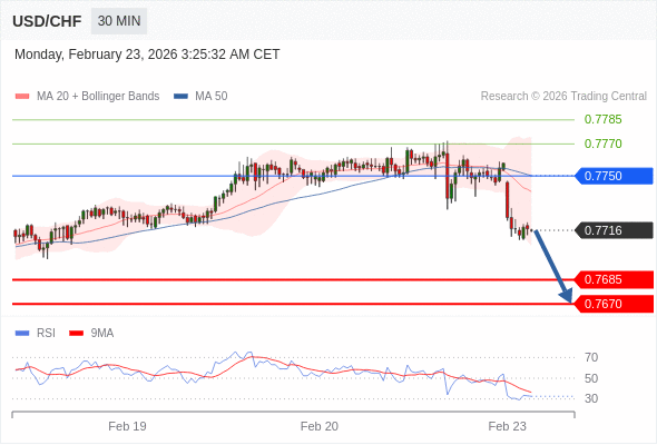 交易策略: 在 0.7750 之下,看跌,目标价位为 0.7685 ,然后为 0.7670 。