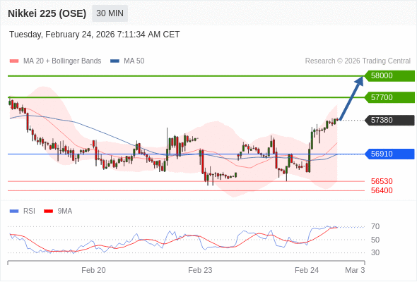 在 56910 之上,看涨,目标价位为 57700 ,然后为 58000 。