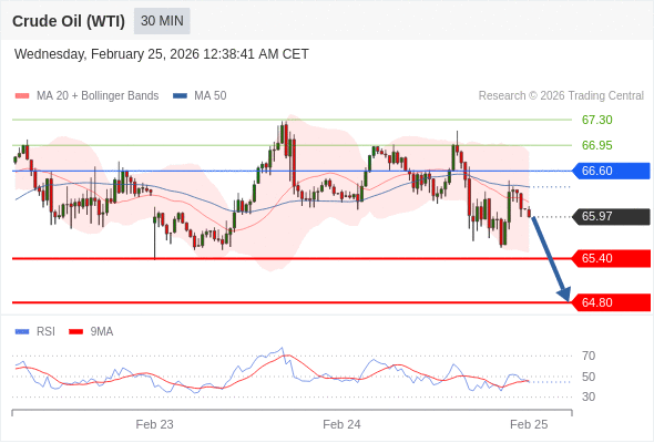在 66.60 之下,看跌,目标价位为 65.40 ,然后为 64.80 。