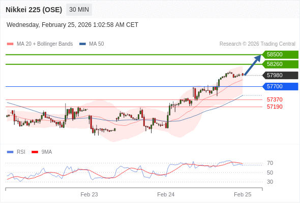 在 57700 之上,看涨,目标价位为 58260 ,然后为 58500 。