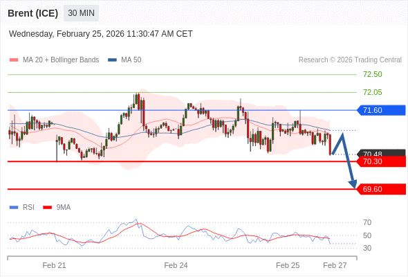 在 71.60 之下,看跌,目标价位为 70.30 ,然后为 69.60 。
