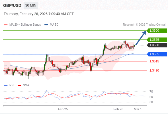 在 1.3535 之上,看涨,目标价位为 1.3575 ,然后为 1.3600 。