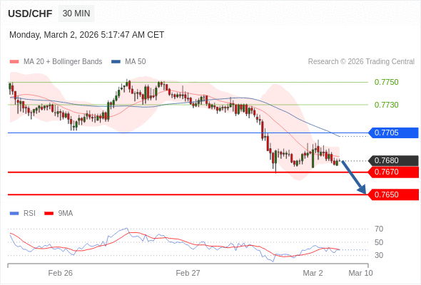 在 0.7705 之下,看跌,目标价位为 0.7670 ,然后为 0.7650 。