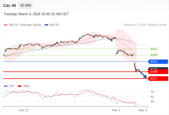 Cac 40 当日内: 短期关键阻力位在8310。