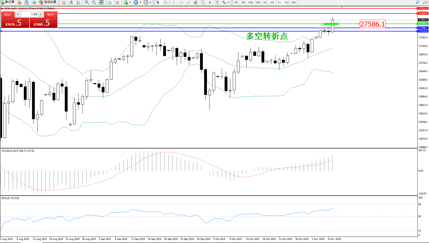 道琼斯指数11月7日(周四)收盘上涨182.20点,涨幅0.66%,报27674.80点。道指刷新收盘历史纪录,国际贸易局势出现积极进展,促使投资者抛售债券转入股市,市场处于全面冒险模式,中美之间达成贸易协议的可能性越来越大,这被认为对美国经济有利,因为它降低美国公司面临的不利因素。