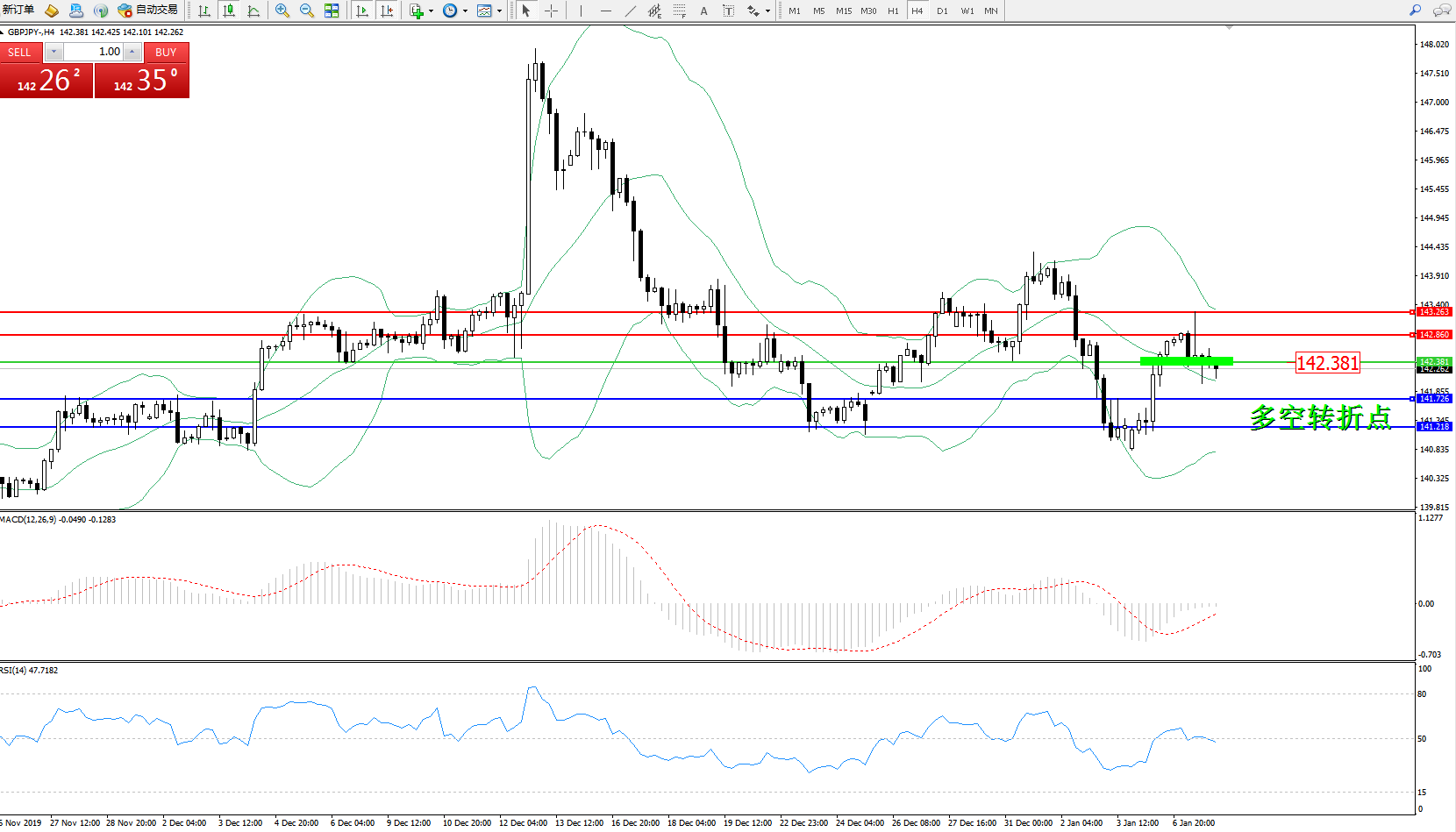 备选策略:142.381上方看涨,目标142.860、143.263