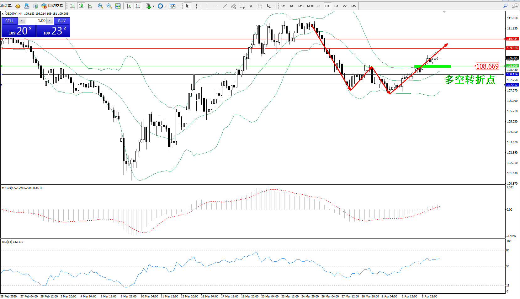 交易策略:108.669上方看涨,目标109.818、110.434