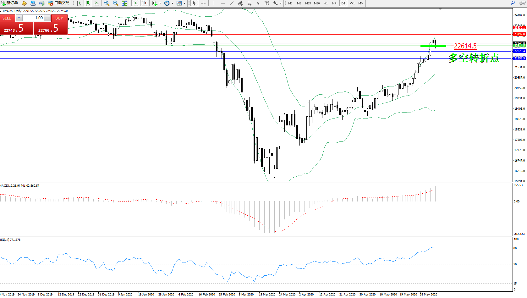 日经225指数6月4日(周四)收盘上涨54.74点,涨幅0.24%,报22668.50点。全球风险情绪进一步升温,欧美股市依旧走高,而投资者对美国国内骚乱事件的影响持看淡态度,并着重解读了ADP就业报告所显示的新增失业人口意外少于预期的向好因素,从而对美国经济重启前景更有信心。日本环球影城(USJ)8日将限定入场者恢复营业,4日先向媒体相关人士公开了预防感染新型冠状病毒的措施。除了规定入场者有义务测体温并戴口罩外,对游乐和室内设施实施消毒。