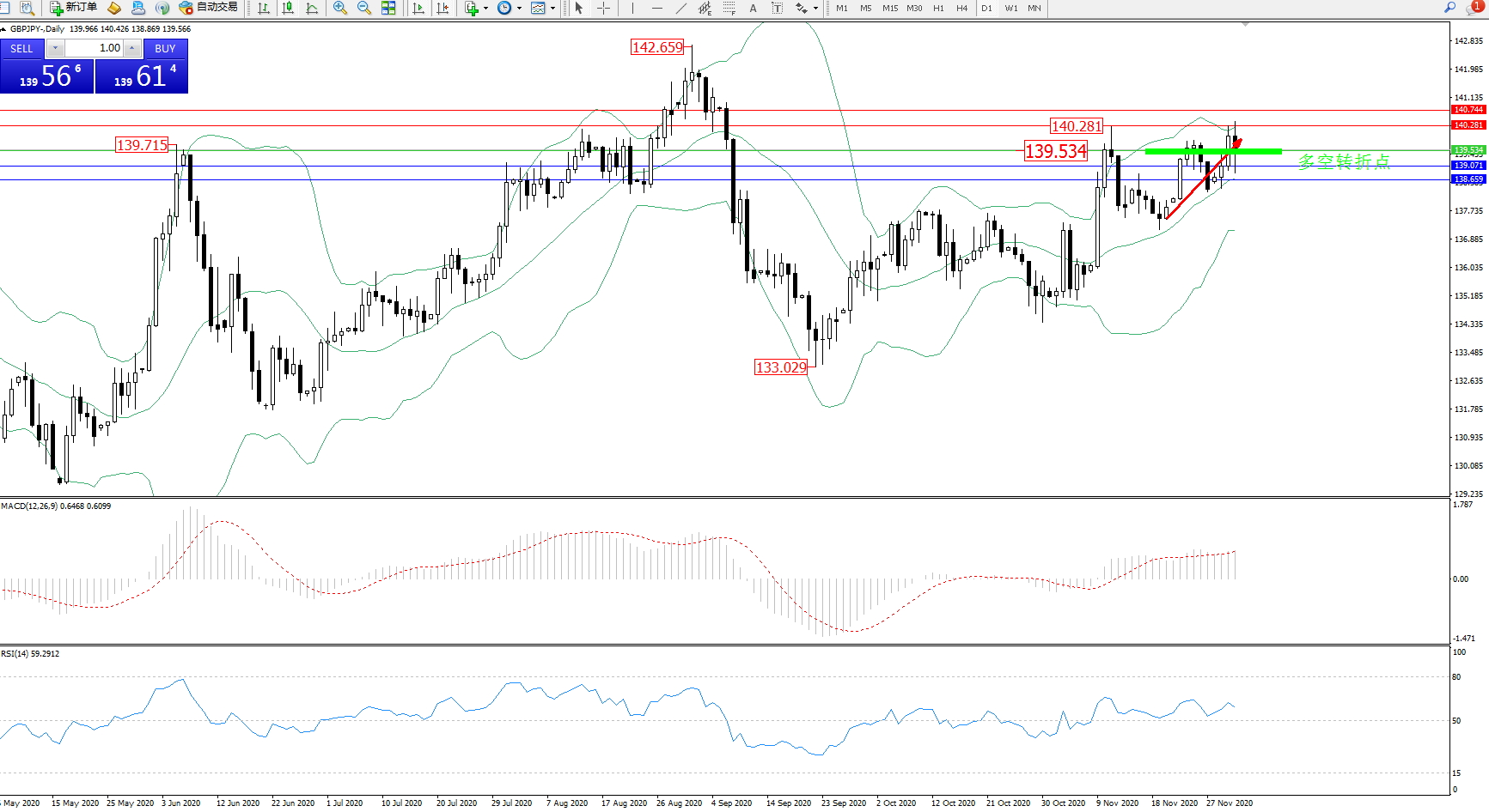 技术点评:多头动力延续布林带指标中上轨区间持续宽幅震荡向上移动态势良好,期间多头动力试探上轨附近节点,前期高位140.281位置已再度触及,且有破位上扬迹象,布林带指标呈收口走势中,MACD指标处于多头区域持续整理平移中,RSI指标处于50均衡线上方维持整理走势向上移动中;