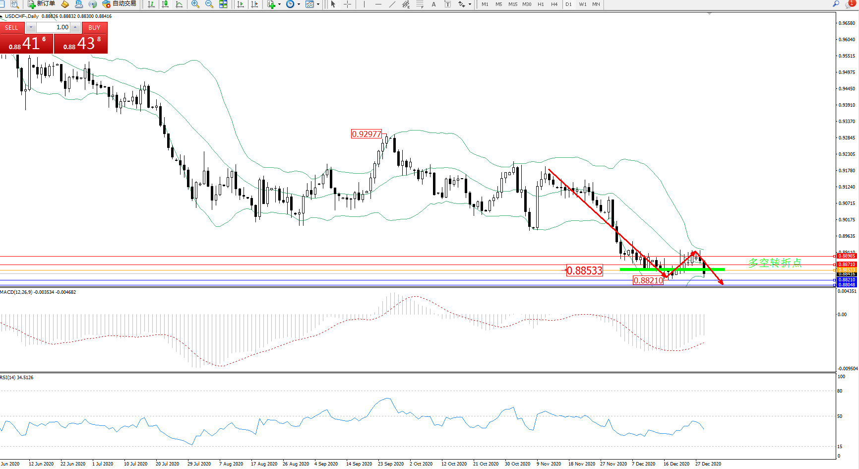 交易策略:0.88533下方看跌,目标0.88210、0.88048