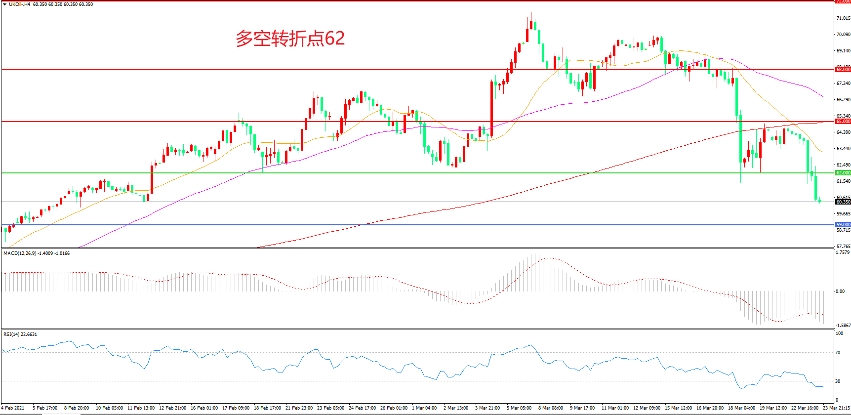 周二(3月23日),涨势熄火的油价再次面临供应和需求的“两面夹攻”,市场避险情绪再度升温,布伦特原油再度遭遇重挫,暴跌逾6%后收报60.35美元/桶。在亚洲疫情逐渐消退的情形下,欧洲疫情却有卷土重来的迹象,一系列新的抗疫措施使得原油消费的前景蒙上一层阴影,而美联储主席鲍威尔在出席国会听证时称“有些资产价格有些高”,也打压了市场中的风险情绪。