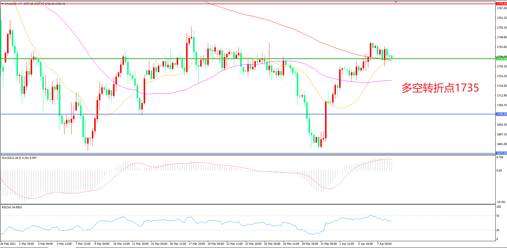 4小时图看,金价突破200周期均线后震荡回踩,短期涨势暂缓,但整体价格仍在前期支撑之上,1735成为短期多空分水岭,MACD红柱增加,RSI指标走平,日内震荡上行概率较大。
