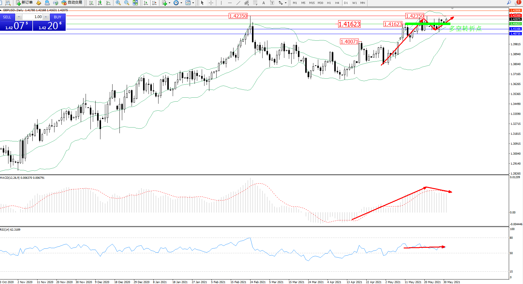 交易策略:1.41623上方看涨,目标1.42350、1.42808