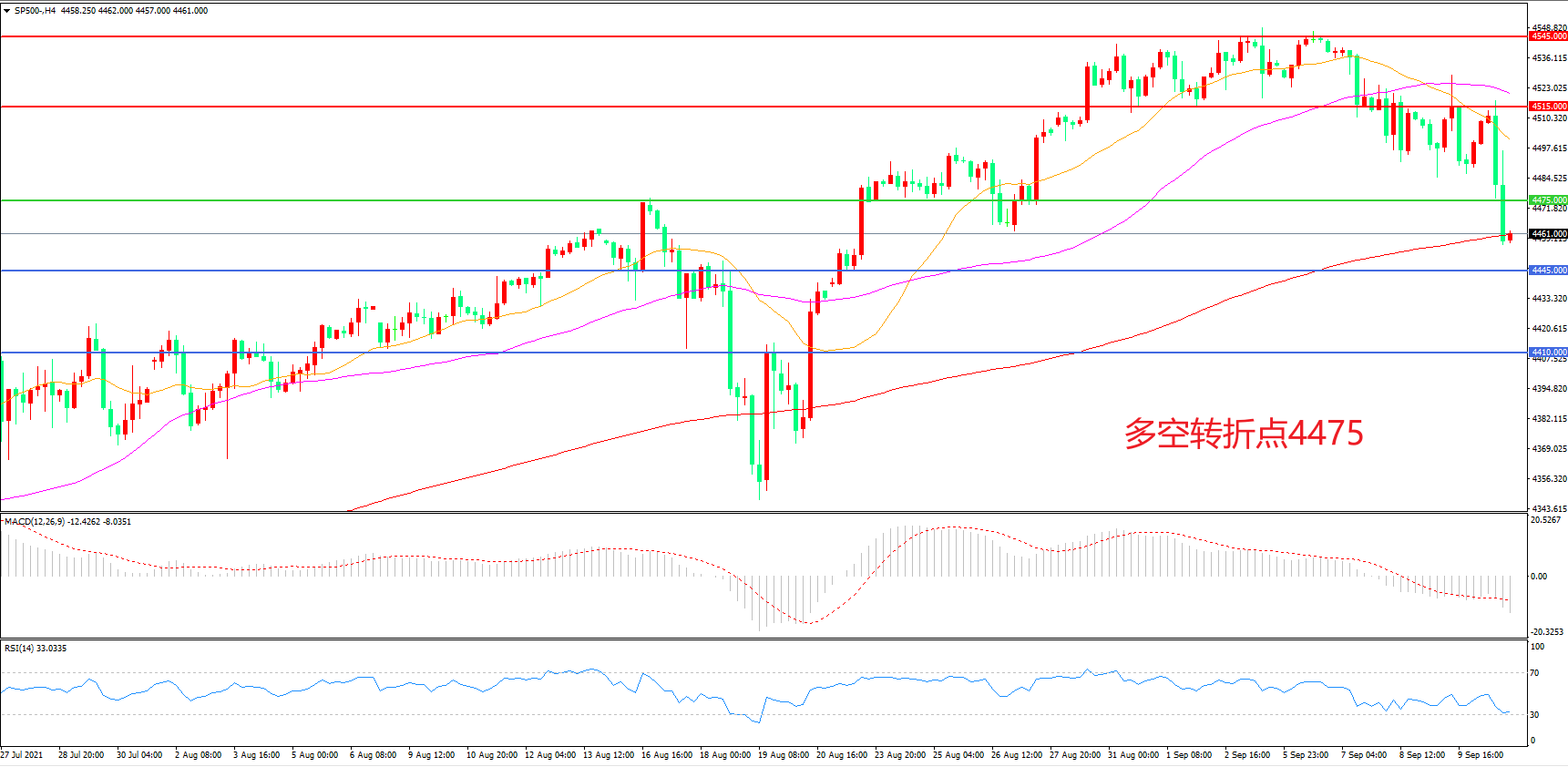4小时图看,标普500长阴连续下破,整体表现低迷,200周期均线成为短期支撑,4475成为多空分水岭, MACD绿柱增加,RSI指标走平,日内震荡下行概率较大。