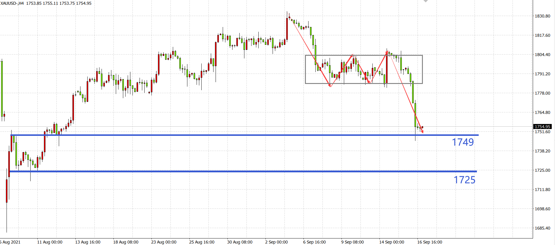 周四(9月16日)“恐怖数据”美国8月零售销售月率公布,录得0.7%,高于前值-1.10%与预期-0.8%,受此影响美指涨势欢欣鼓舞,现货黄金较日高回落46美元,一度跌破1750关口。短期来看,零售销售数据好转缓解市场对经济复苏的担忧,市场对于美联储的Taper与其加强,,鹰派美联储可能继续主导市场基调,在此基调下美元走强将打压黄金下行
