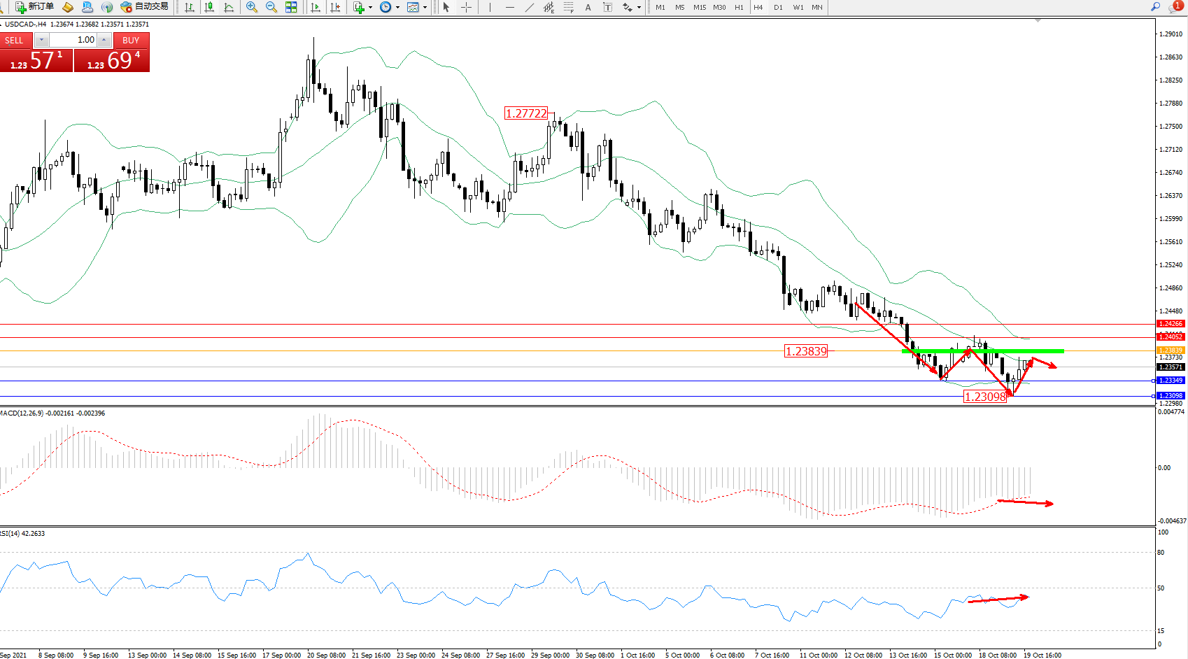 技术点评:空头动力延续布林带指标通道中下轨区间持续震荡下行,低位抵达1.23098位置后得到短暂支撑,但下行趋势态势良好,低位短期反转震荡仅仅是为下行空间短期整理,布林带指标呈收口走势持续向下移动中,MACD指标处于0轴线下方空头区域维持整理平移,RSI指标处于50均衡线下方空头区域维持整理徘徊中;