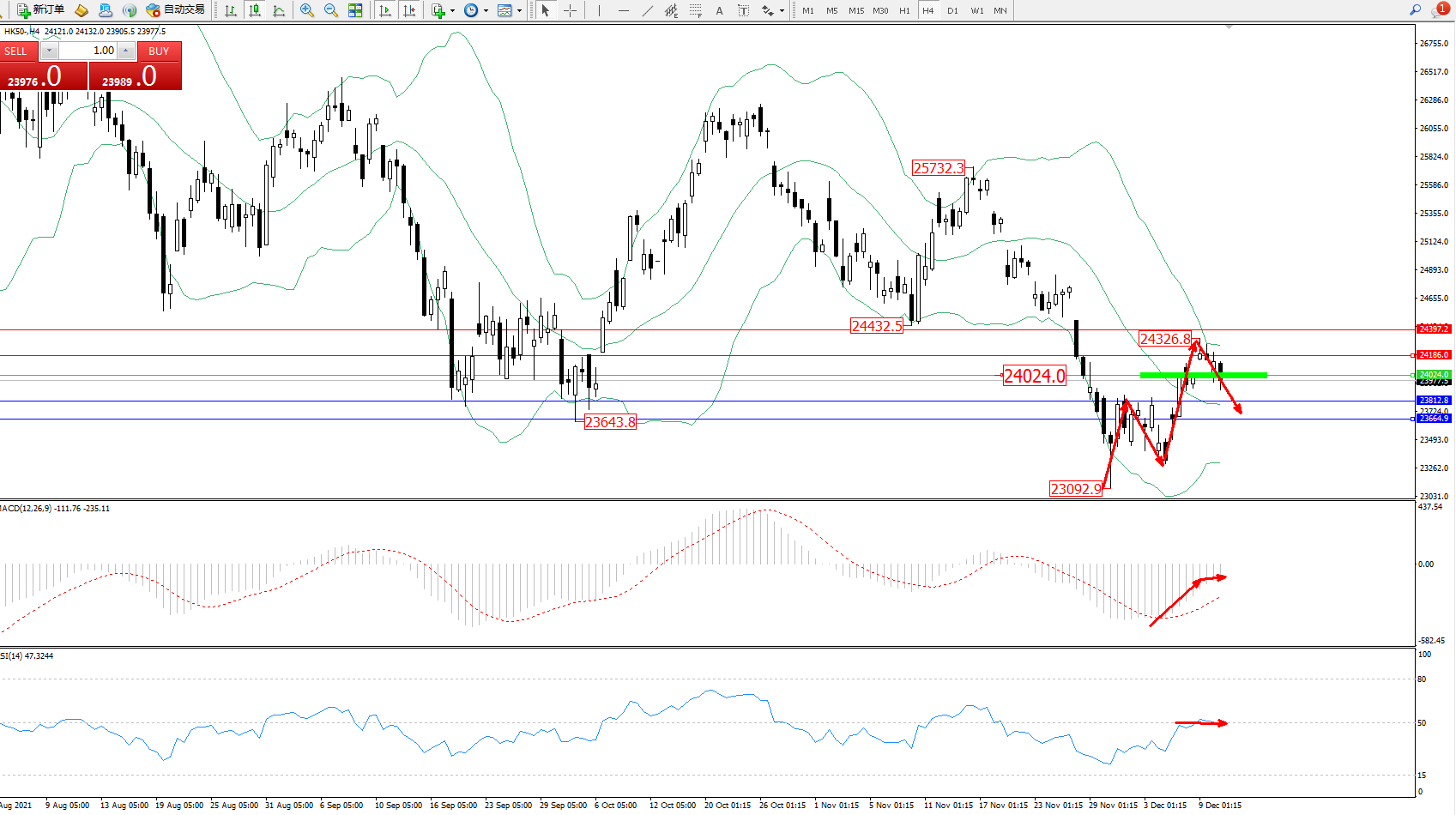 恒指HK50 ——4小时K线图显示: