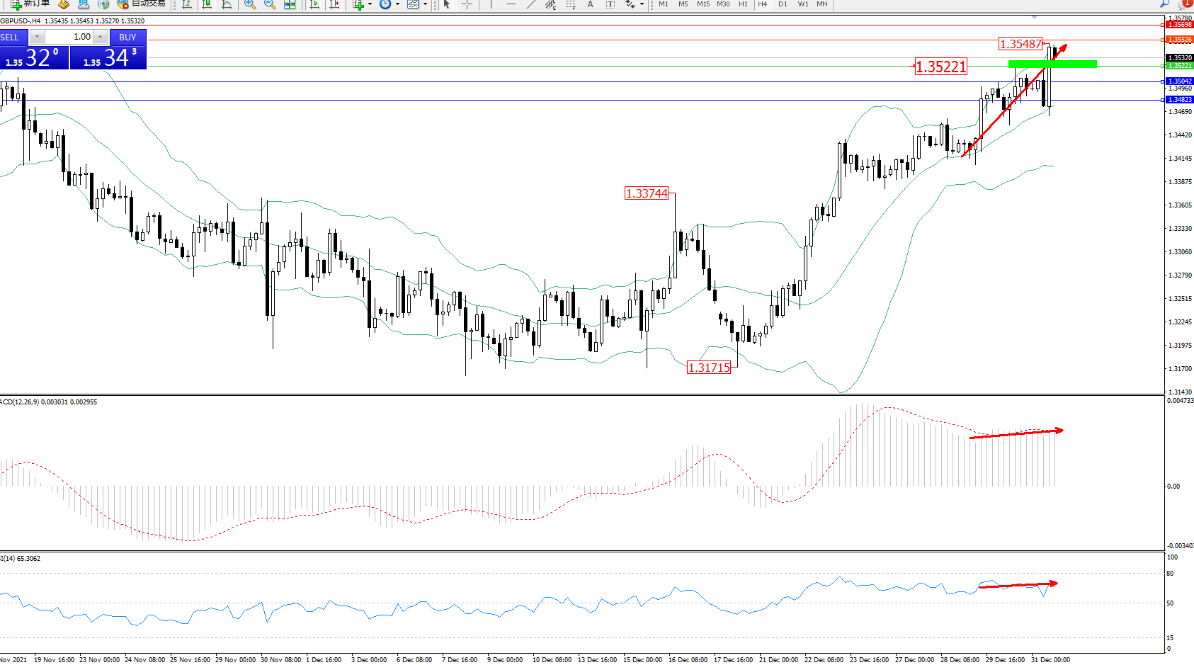 交易策略:1.35221上方看涨,目标1.35526、1.35698