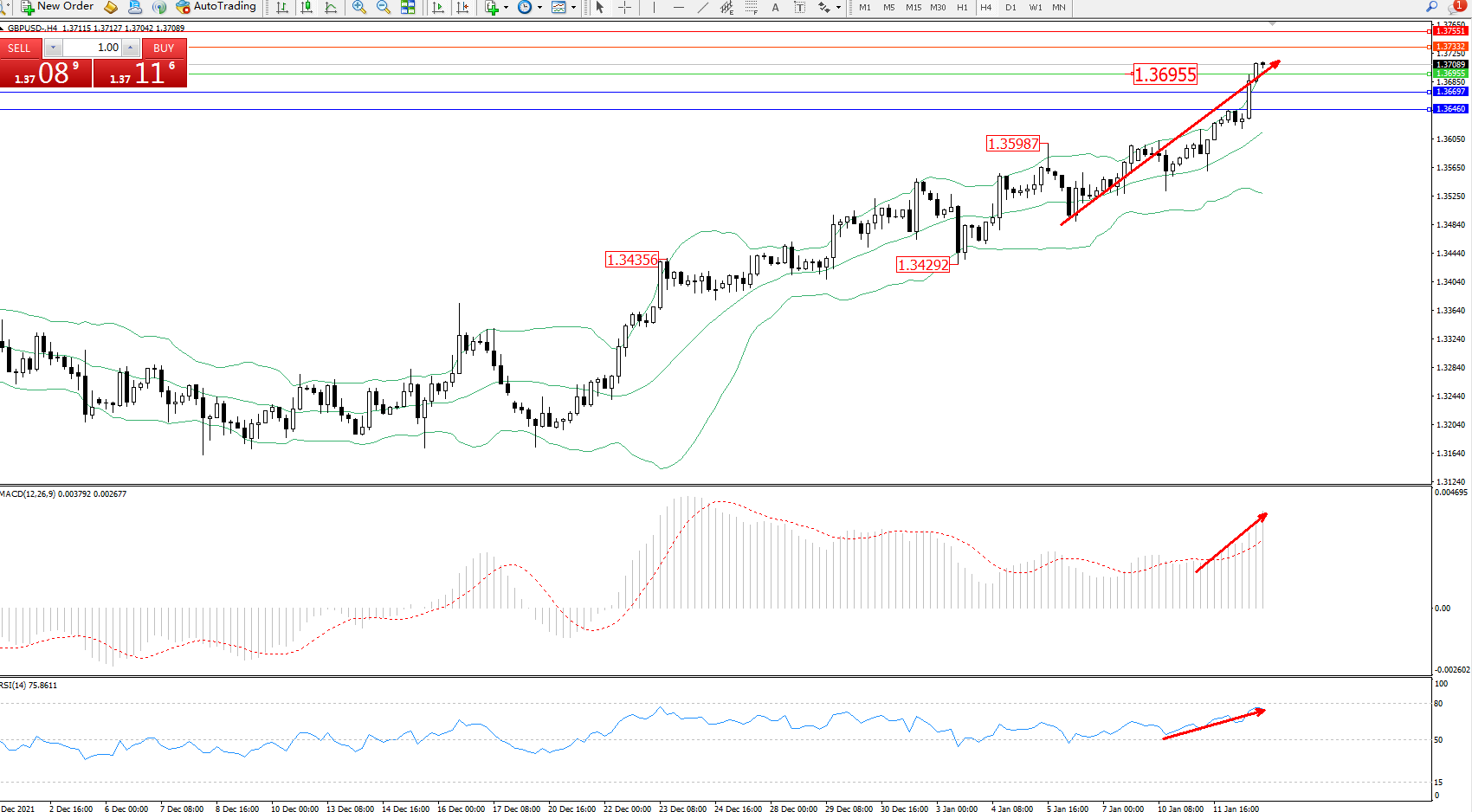 交易策略:1.36955上方看涨,目标1.37332、1.37551