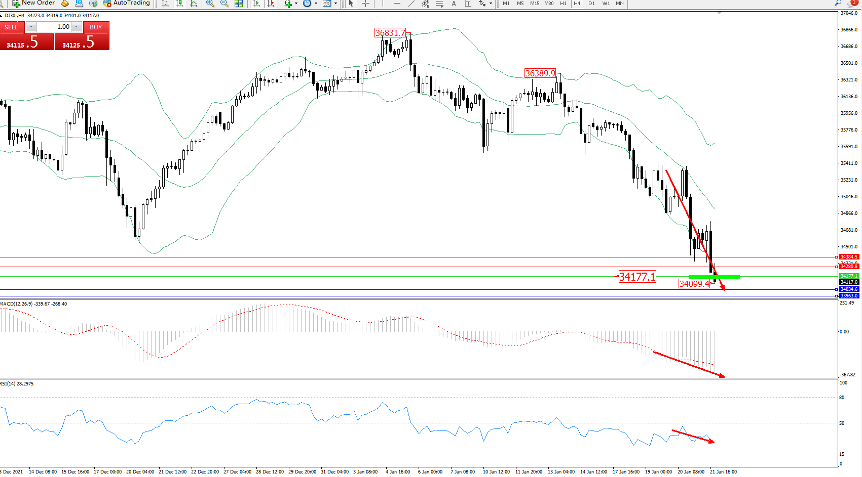 道琼斯指数DJ30——4小时K线图显示: