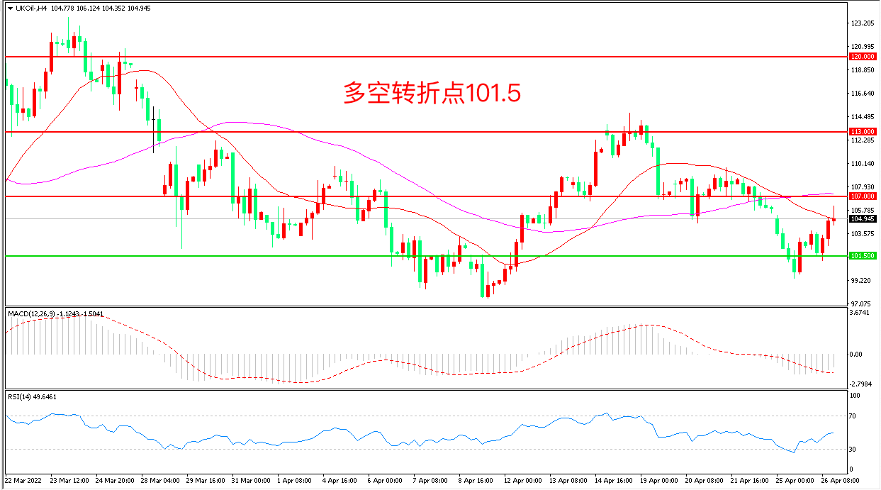 周二(4月26日),莫斯科与欧洲各国在关键能源供应问题上的紧张关系出现重大升级,俄罗斯将在切断向波兰的天然气供应,市场担忧情绪推动布伦特原油顺势反弹,收报104.94美元/桶。周三(4月26日),美国石油协会数据显示API美国原油累库487.4万桶,远超市场预期,如果晚间EIA表现与此一致,可能会对油价形成打压。