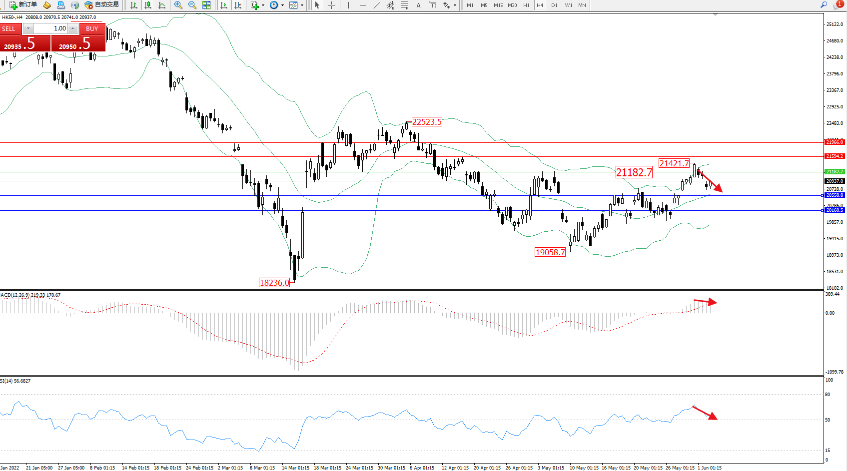 恒指HK50 ——4小时K线图显示:
