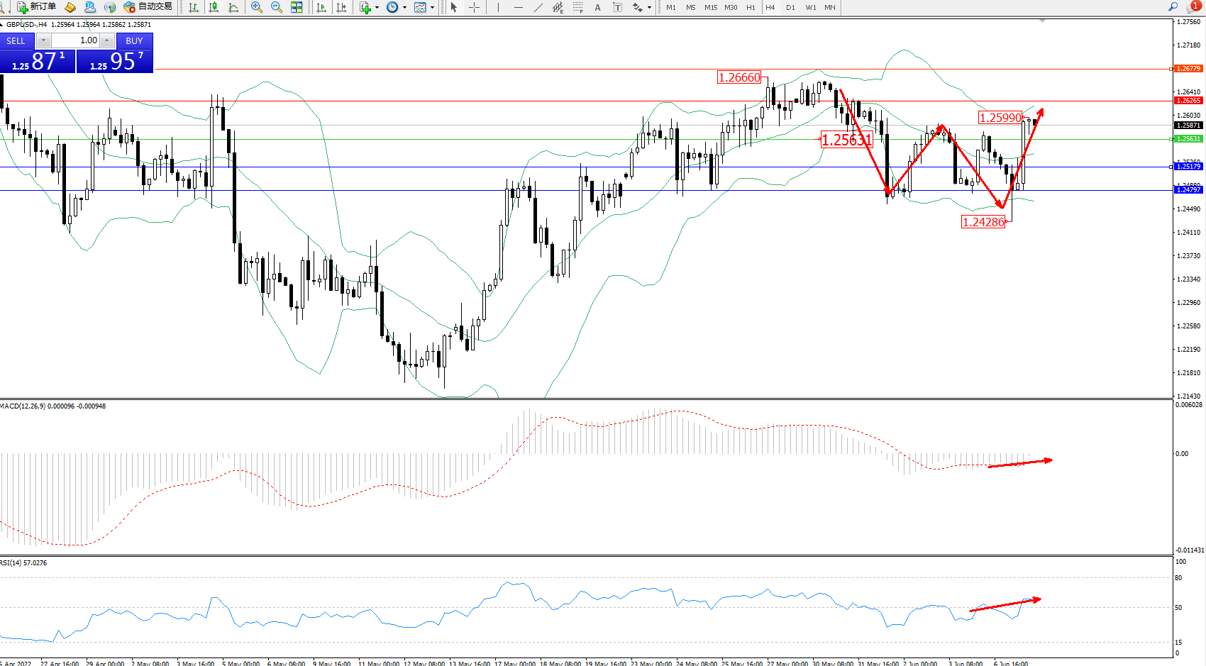 交易策略:1.25631上方看涨,目标1.26265、1.26779