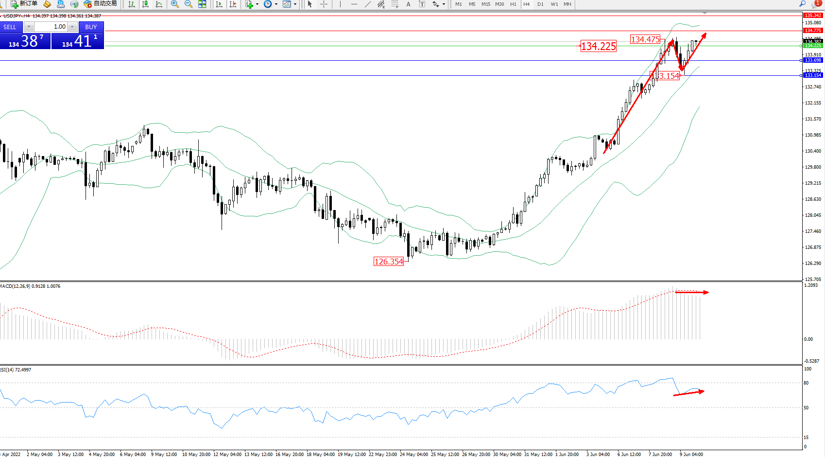 交易策略:134.225上方看涨,目标134.775、134.342