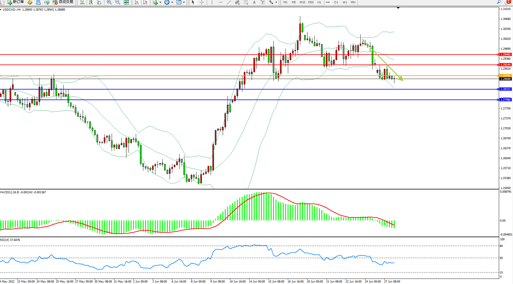 美元加元USDCAD——4小时K线图显示: