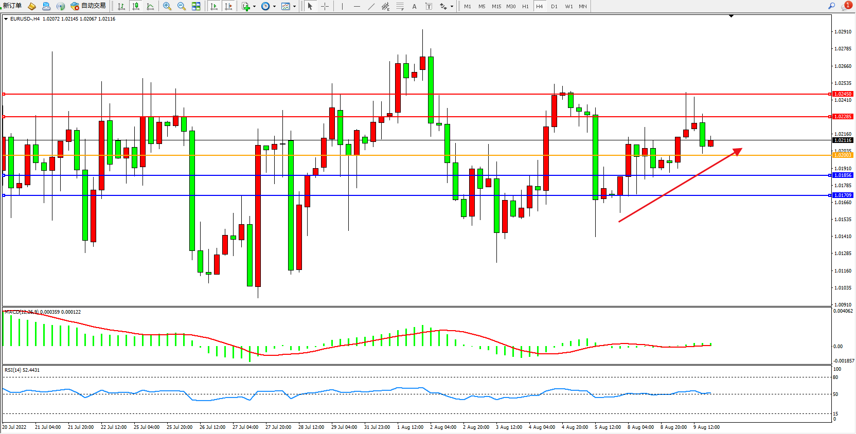 4小时图看:多头动力维持震荡向上移动,短期拉升上移走势或将延续,MACD指标处于0轴线上側徘徊,RSI指标处于50均衡线上側窄幅整理;