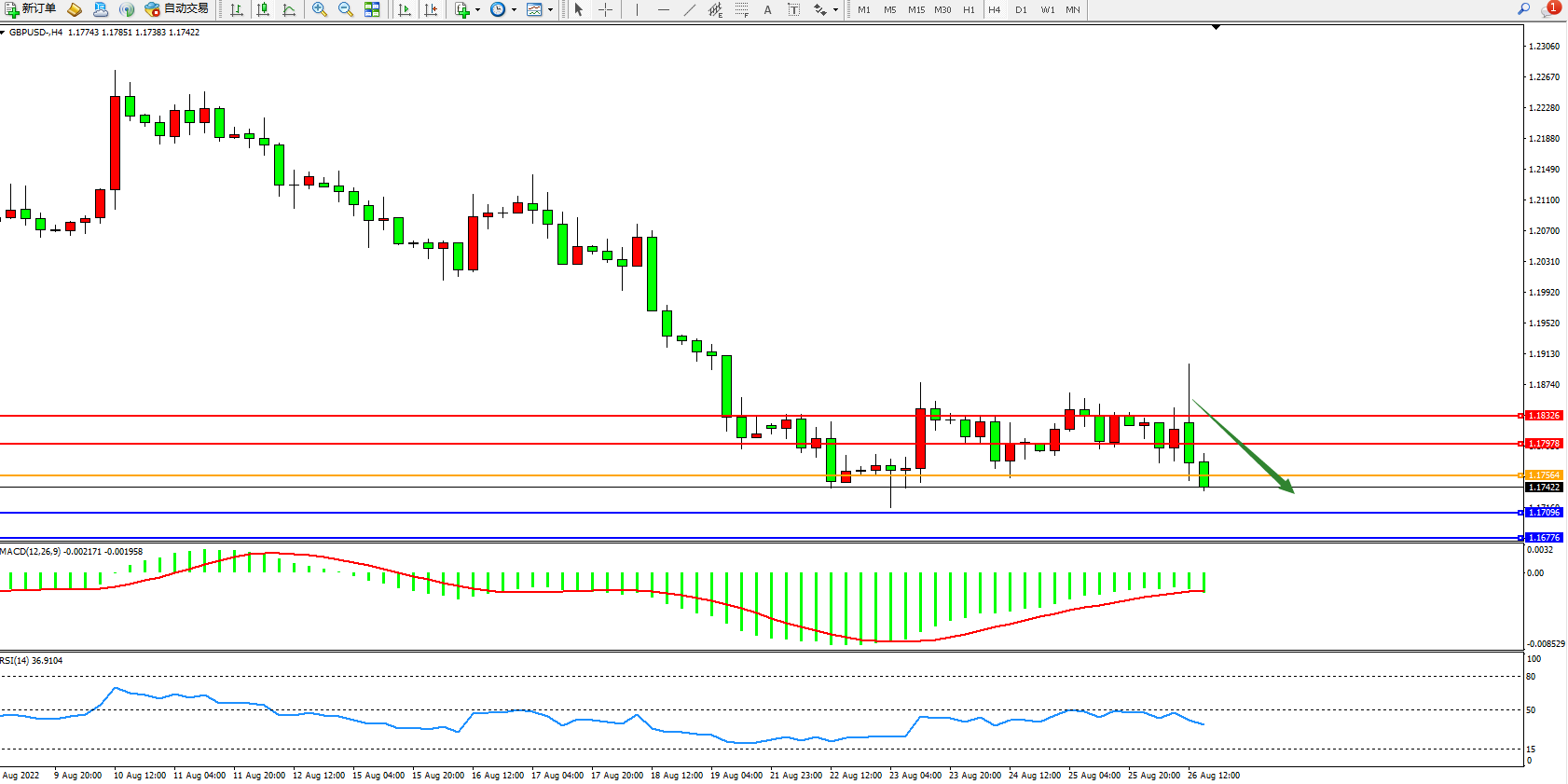 交易策略:1.17564下方看跌,目标1.17096、1.16776