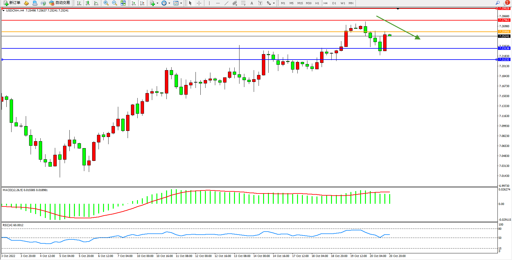 美元人民币USDCNH——4小时K线图显示: