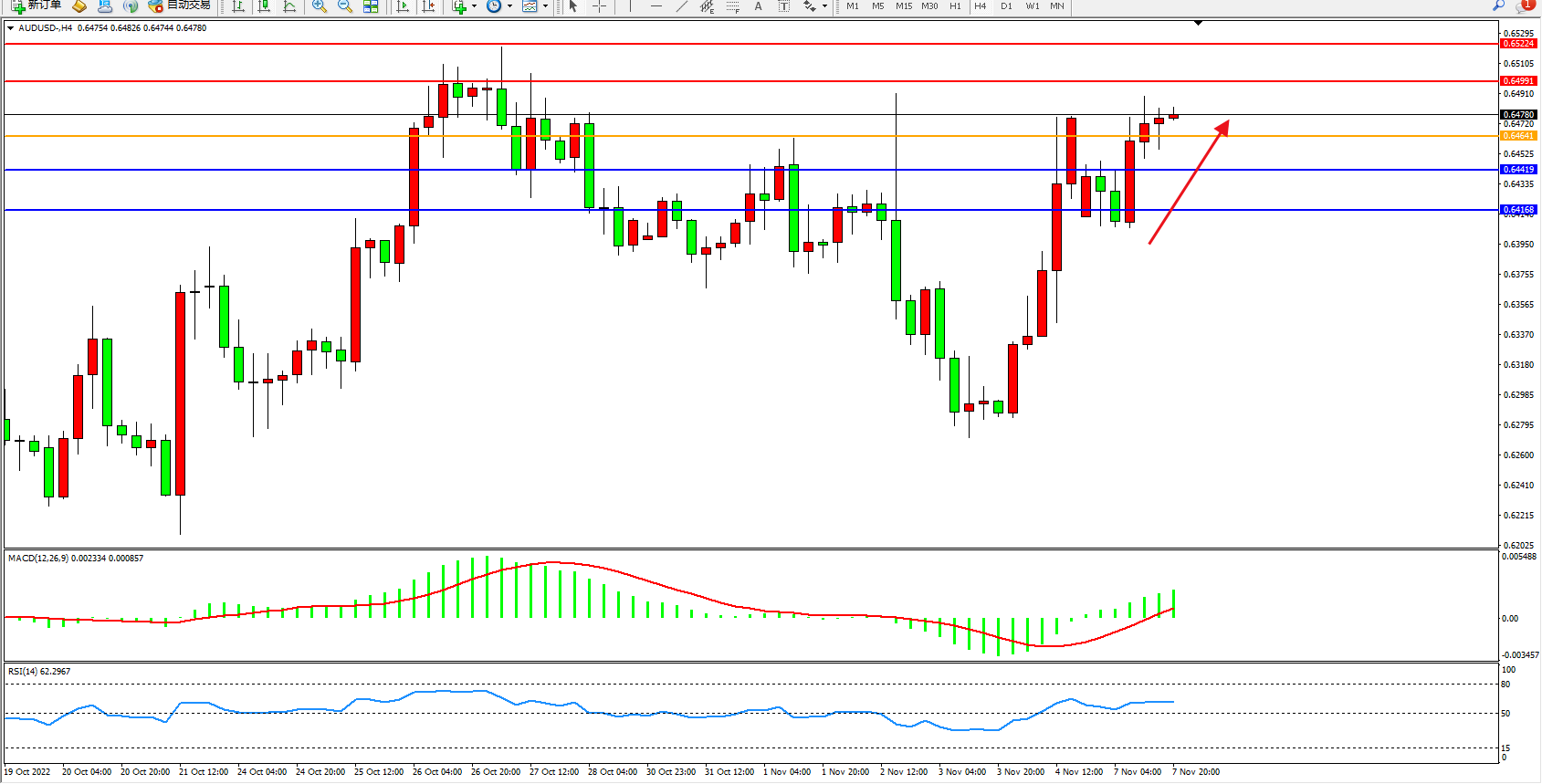 澳元美元AUDUSD——4小时K线图显示: