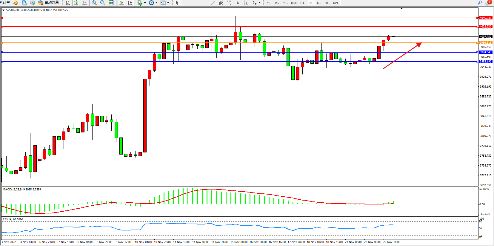 标普SP500——4小时K线图显示: