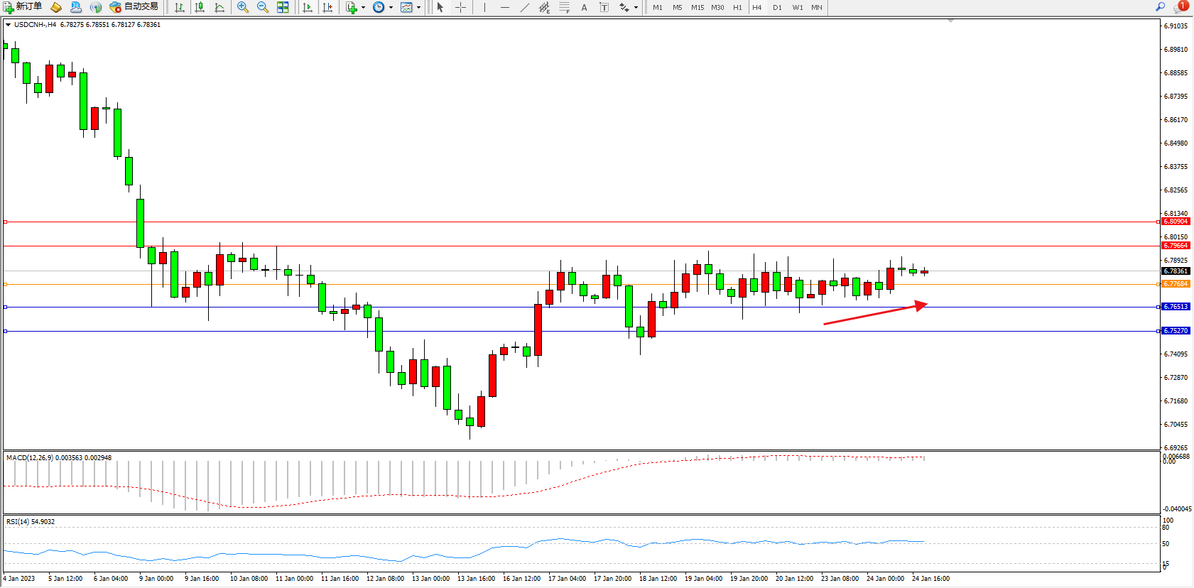 交易策略:6.77684上方看涨,目标6.79664、6.80904