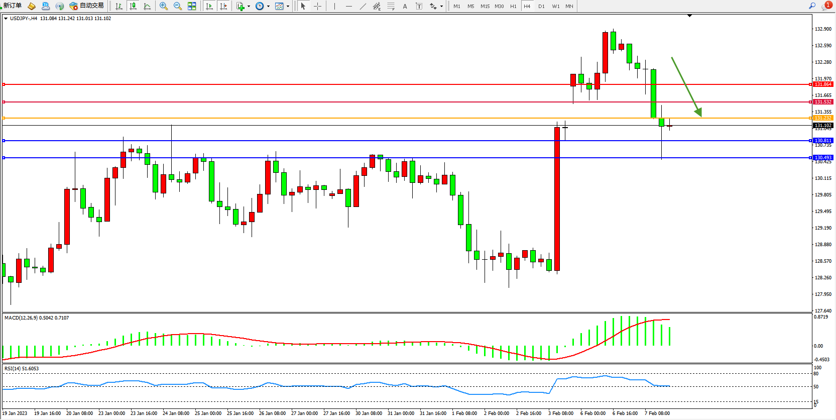 交易策略:131.232下方看跌,目标130.811、130.493