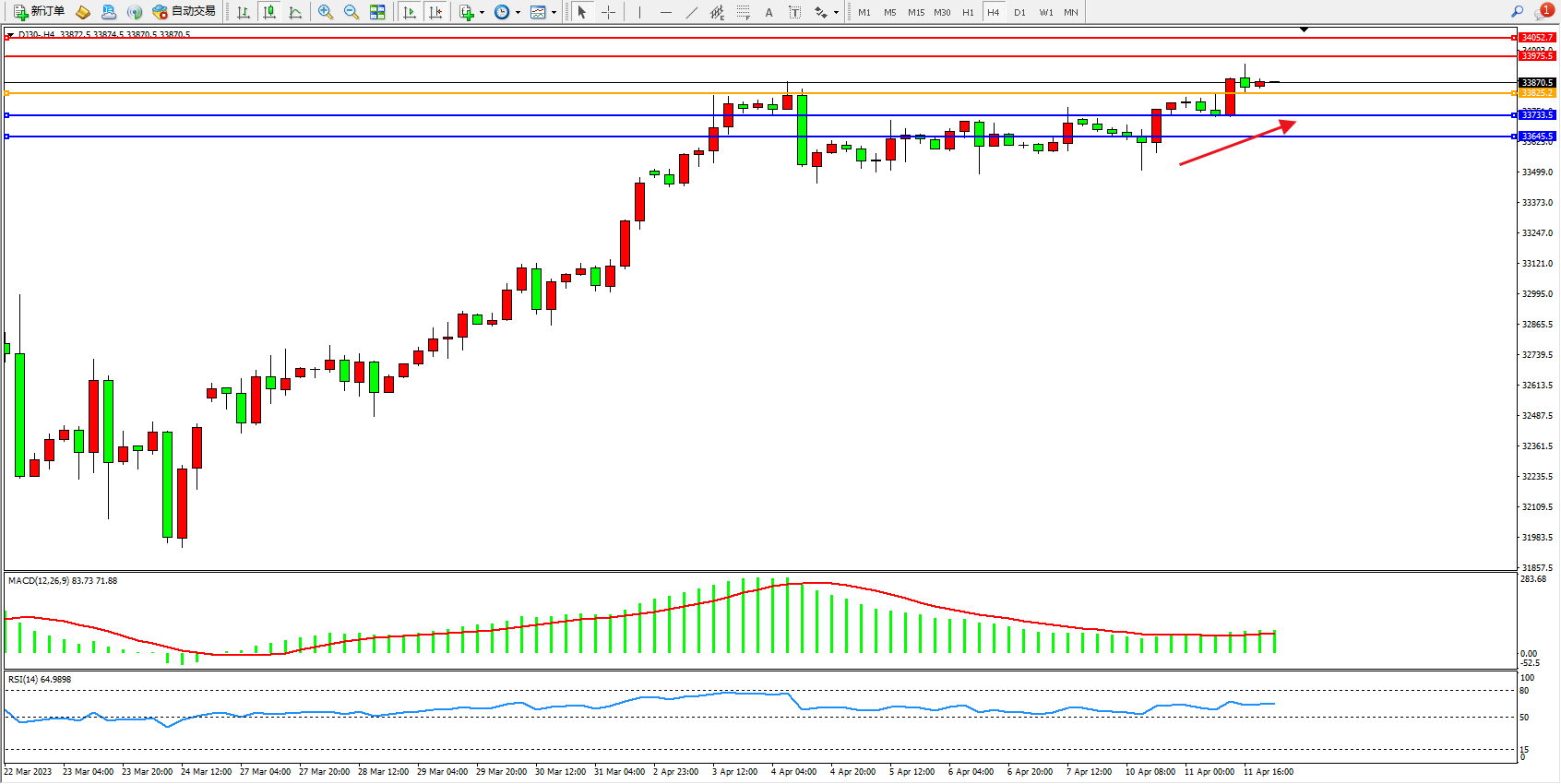 道琼斯指数DJ30——4小时K线图显示: