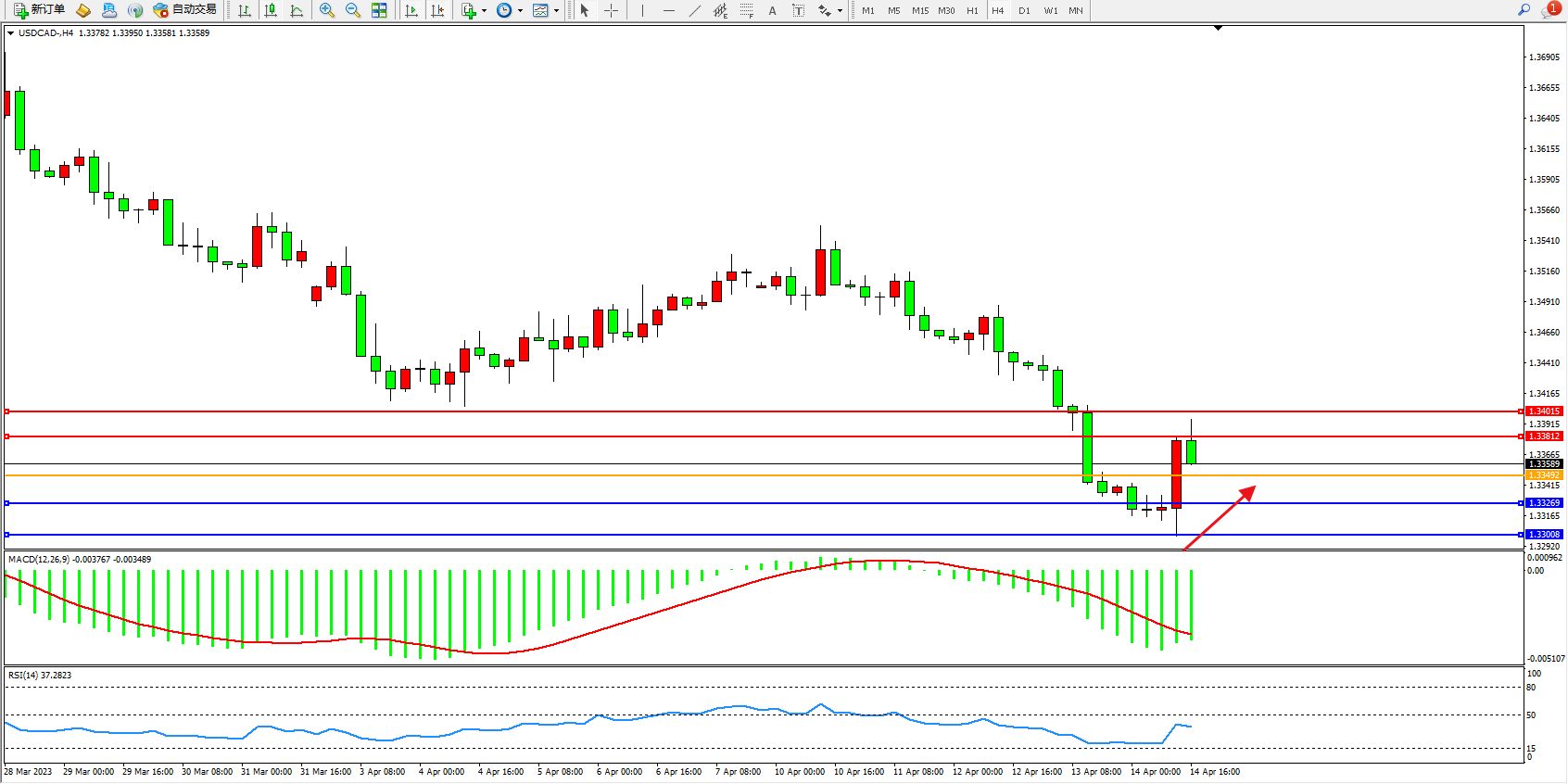 美元加元USDCAD——4小时K线图显示: