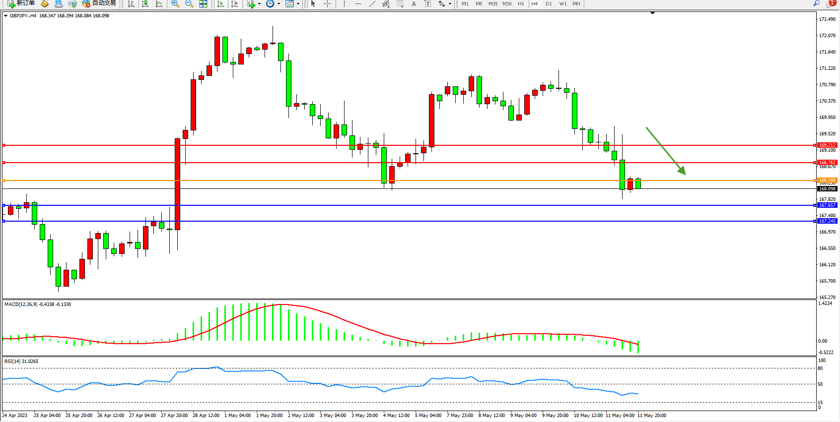 交易策略:168.299下方看跌,目标167.657 167.245