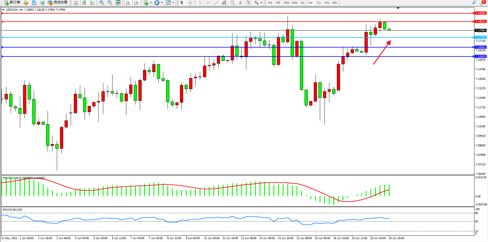 交易策略:7.17353上方看涨,目标7.18631  7.19305