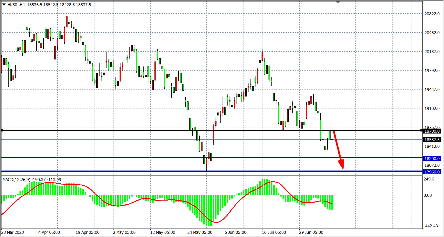 4小时图看,恒指在18700之下持续走低,MACD量能零轴下放量,趋势走空头,阻力继续关注18700附近,该位下继续看跌18200-17960。