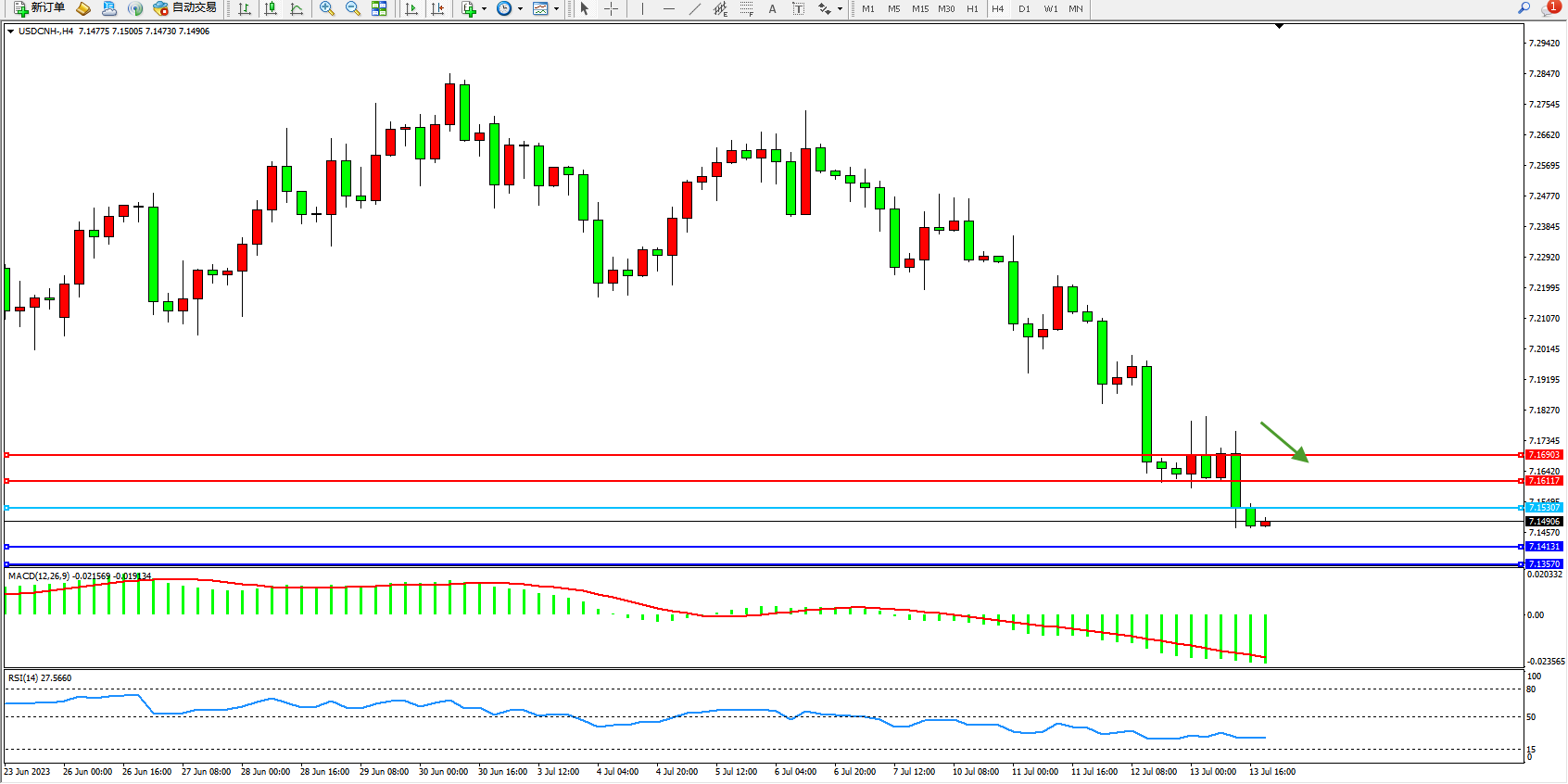 交易策略:7.15307下方看跌,目标7.14131  7.13570