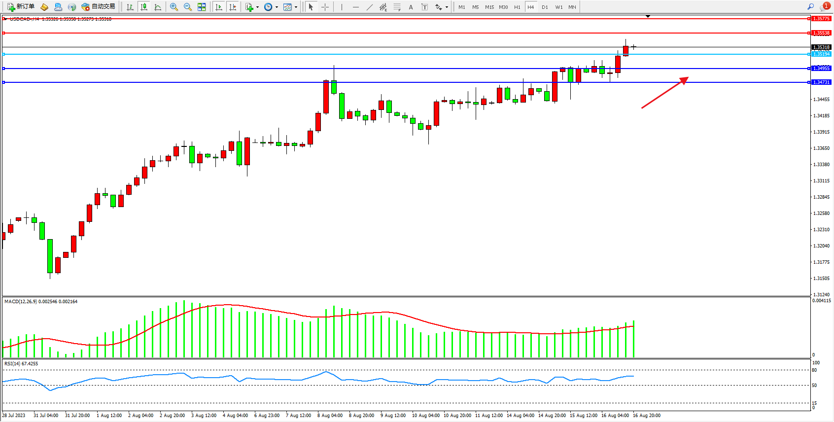 美元加元USDCAD——4小时K线图显示: