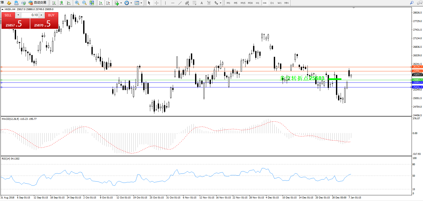 恒指HK50 ——4小时K线图显示: