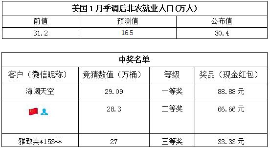 “1月份非农就业人数大竞猜”活动的中奖结果已出,获奖信息如下: