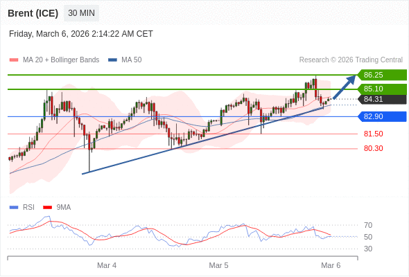 布伦特原油 (ICE) (K6) 当日内: 在82.90之上,看涨。