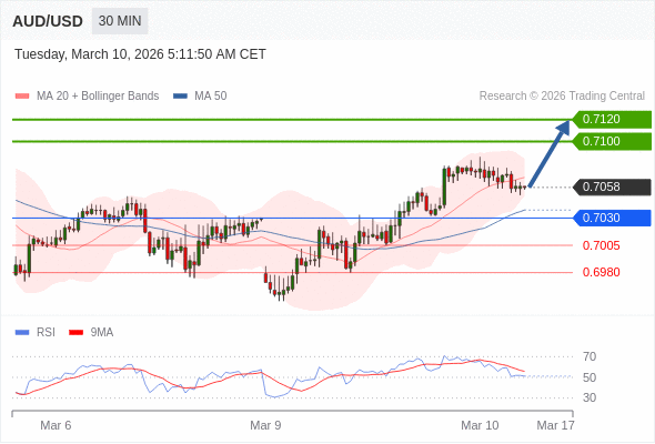 在 0.7030 之上,看涨,目标价位为 0.7100 ,然后为 0.7120 。