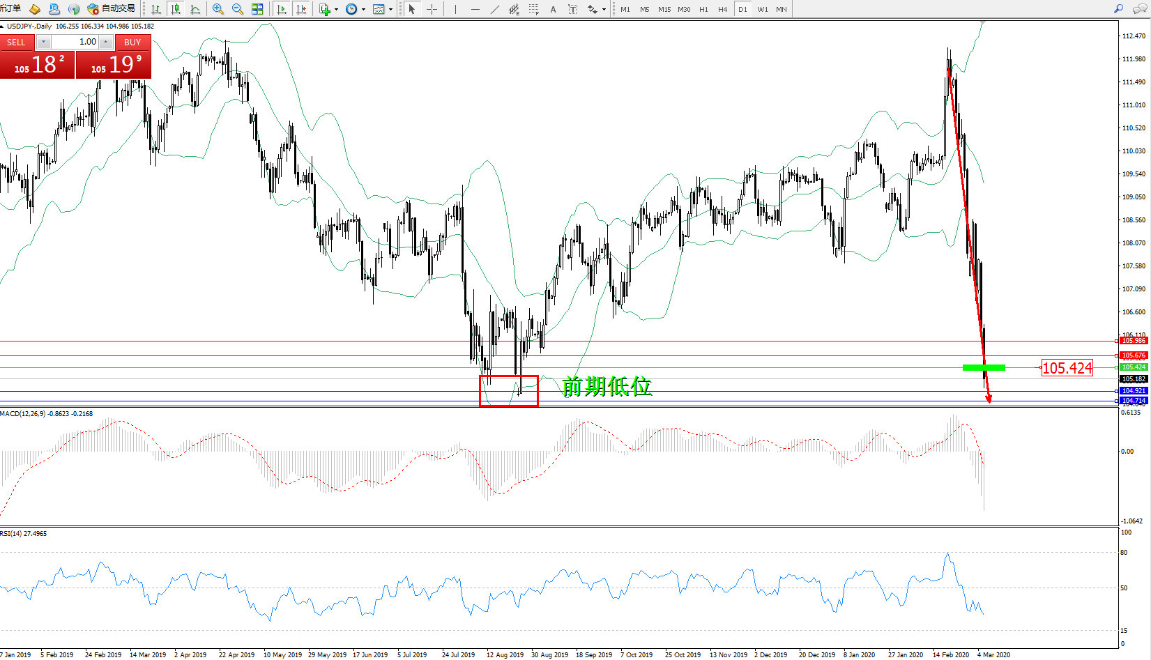 交易策略:105.424下方看跌,目标104.921、104.714