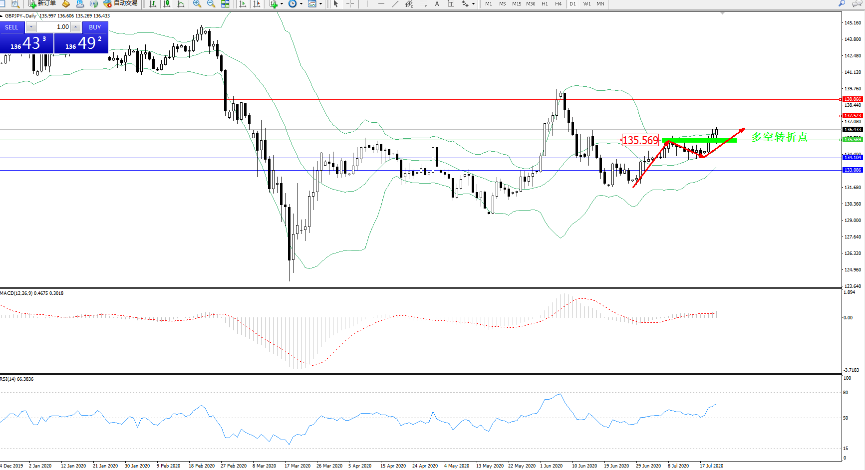 交易策略:134.999上方看涨,目标137.523、138.866